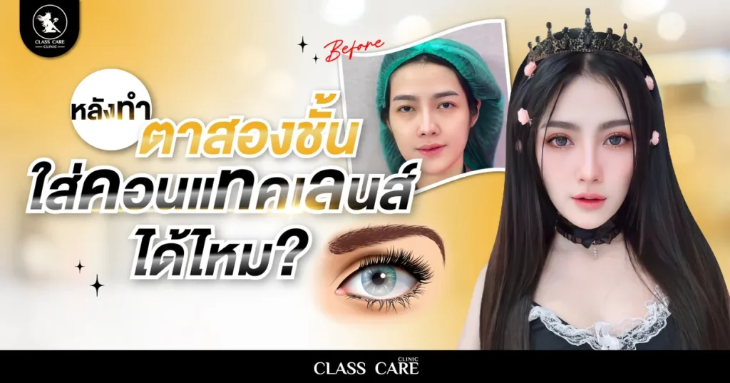 เพื่อน ๆ ที่ชอบใส่คอนแทคเลนส์อาจจะกังวลใช่ไหมคะ ว่าหลังทำตาสองชั้นใส่คอนแทคเลนส์ได้ไหม? ตอบเลยว่าไม่ต้องห่วงค่ะ! สามารถกลับมาใส่คอนแทคเลนส์ได้เมื่อแผลหายสนิทและไม่มีอาการบวมหรือระคายเคือง ซึ่งโดยปกติแล้วจะต้องรอประมาณ 2-3 สัปดาห์หลังการผ่าตัดค่ะ ที่ Classcare Clinic เรามีข้อมูลและเคล็ดลับดี ๆ เกี่ยวกับการดูแลตัวเองเพื่อให้เพื่อน ๆ สามารถใส่คอนแทคเลนส์ได้เร็วขึ้น มาติดตามกันได้เลยค่ะ!