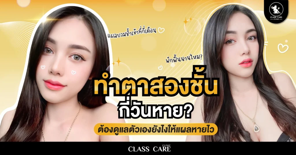 สำหรับเพื่อน ๆ ที่อยากทำตาสองชั้น เเต่กังวลว่า ทำตากี่วันหาย มาค่ะ เดี๋ยวจะตอบให้ฟัง จริง ๆ เเล้ว ถ้าเรากินยาตามที่คุณหมอแนะนำและไม่มีอะไรมากระทบแผล แผลก็จะหายประมาณ 1-3 เดือนค่ะ แต่มันก็ขึ้นอยู่กับการดูแลตัวเองของแต่ละคนด้วยนะคะ วันนี้ Classcare Clinic ได้รวบรวมข้อมูลดี ๆ มาให้เพื่อน ๆ แล้วค่ะ