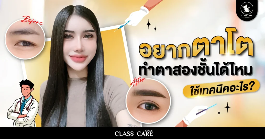 เพื่อน ๆ ที่ตาแคบ ตาเล็กแล้วอยากตาโตขึ้น โอกาสมาถึงแล้วค่ะ! การทำตาสองชั้นด้วยเทคนิคต่าง ๆ เช่น กรีดสั้น แผลมินิ, กรีดยาว, การเปิดหัวตา หรือการยกกระชับกล้ามเนื้อตา สามารถช่วยทำให้ดวงตาของเพื่อน ๆ ดูโตขึ้นอย่างเห็นได้ชัดเลยนะคะ วันนี้ Classcare Clinic ได้รวบรวมเทคนิคที่จะช่วยให้ดวงตาของคุณดูสดใสและโตขึ้นมาฝากแล้วค่ะ ใครที่อยากตาดูโตและสวยขึ้นต้องลองเลย!