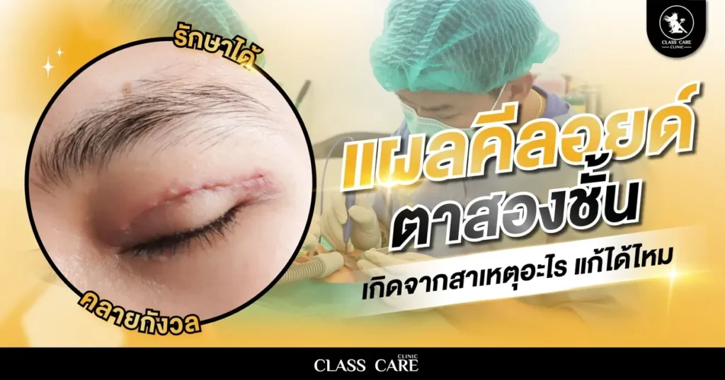 แผลคีลอยด์ตาสองชั้น เกิดจากการดูแลตัวเองไม่ดีหลังผ่าตัด เช่น การโดนน้ำและแสงแดด การกินของแสลง หรือการดื่มแอลกอฮอล์และสูบบุหรี่ แต่ไม่ต้องกังวลไปค่ะ เพราะมันแก้ได้! เราสามารถใช้ยาลดรอยแผลอย่าง Stratamed, นวดแผลบ่อย ๆ, ฉีดยารักษาคีลอยด์, ใช้แผ่นแปะรอยแผลเป็น หรือทำเลเซอร์ได้ ถ้าเพื่อน ๆ ต้องคำเเนะนำเพิ่มเติม ก็สามารถมาปรึกษาคุณหมอที่ Classcare Clinic ได้เลยนะคะ
